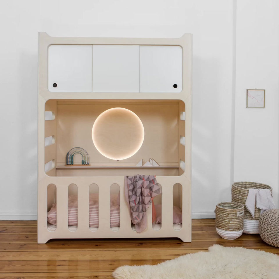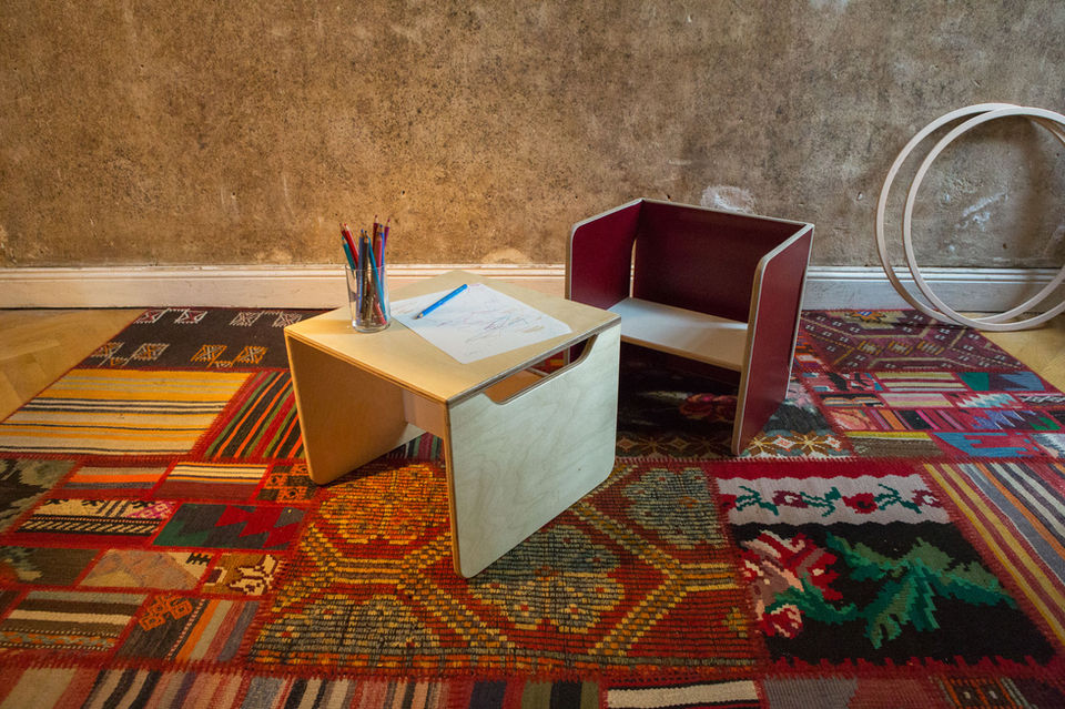 Zum Entwurf inspiriert oft die eigene Tochter, die auch alle Prototypen testet, bevor die Stücke in (Klein-)serie gehen. Meine Produkte wachsen mit dem Kind und sind oft auf verschiedene Arten zu verwenden. Einige Kleinmöbel, wie der Wendestuhl Fl!ip, sind angelehnt an Maria Montessori. Sie regen zum Handeln und Entdecken an. Durch ihre ruhige und ausgewogene Ästhetik fügen sie sich gut in unterschiedliche Raumsituationen ein.Die stapelbare Kistenbank Kiba sowie das wandelbare Mondbett Noom sorgen zudem für mehr Platz im Kinderzimmer;).